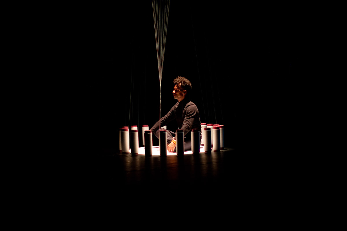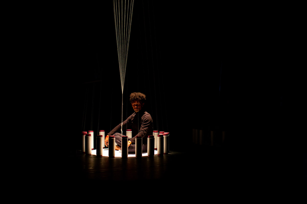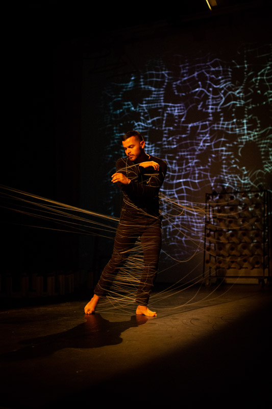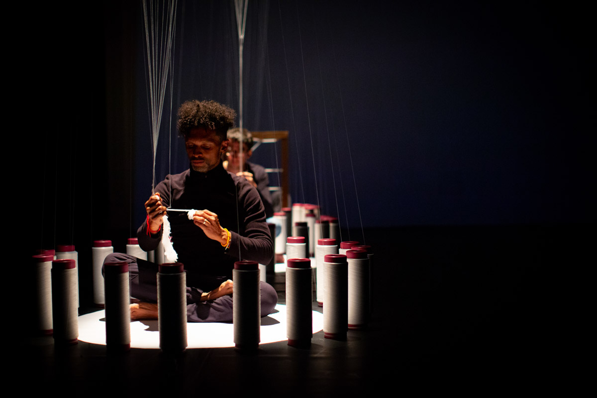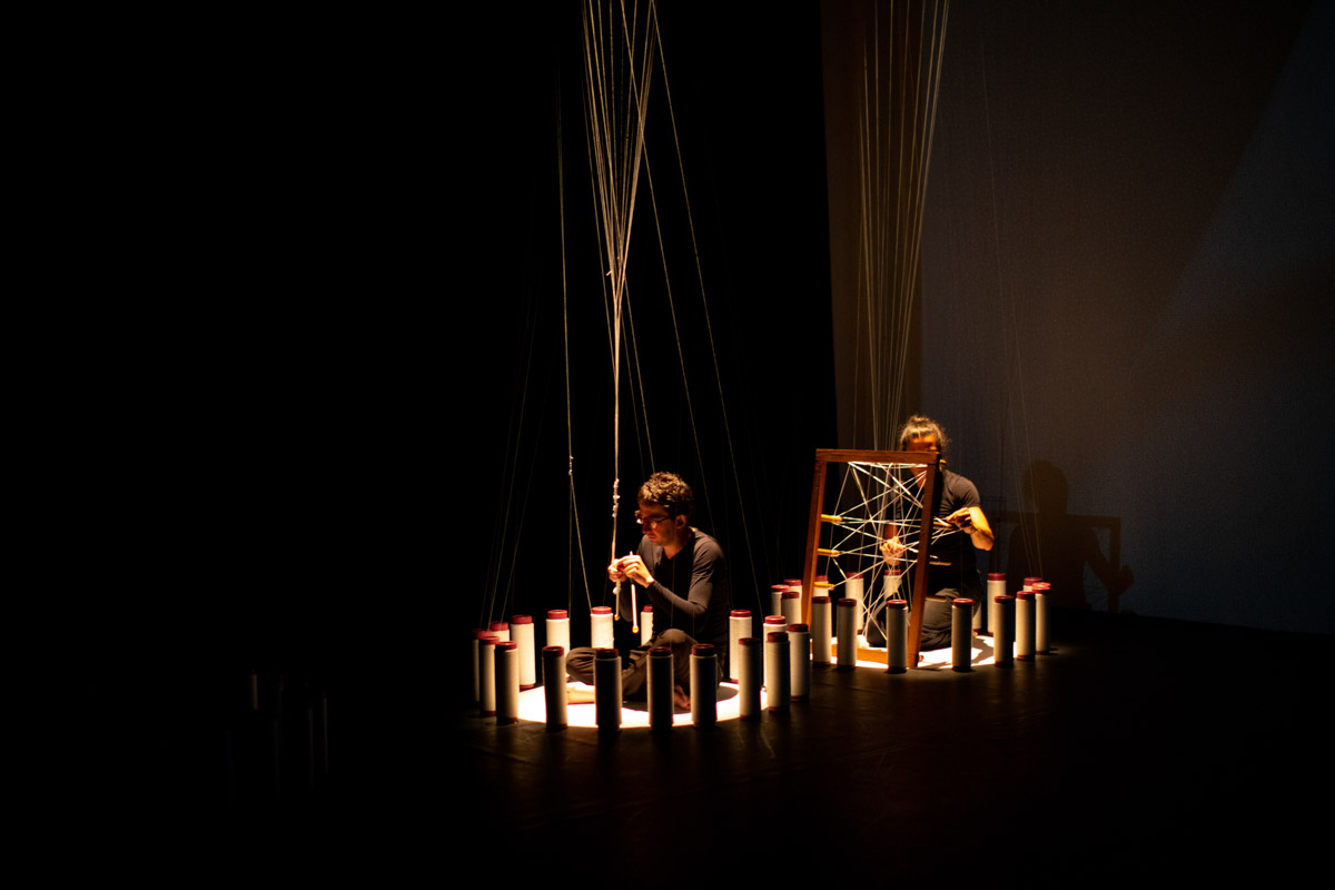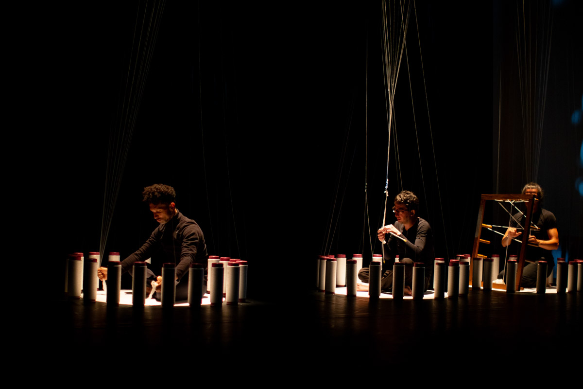 En la segunda escena el objeto textil se presenta como una experiencia háptica en donde incorpora algunos mecanismos asociados al desarrollo y a la industrialización de la tejeduría y que operados por tejedores in situ, reflexionan sobre el quehacer y la relación máquina – hombre. Los movimientos corporales producto del tejer, logran una remembranza de las formas primigenias del oficio, y también de las formas de mecanización gracias a la serialidad en el movimiento.